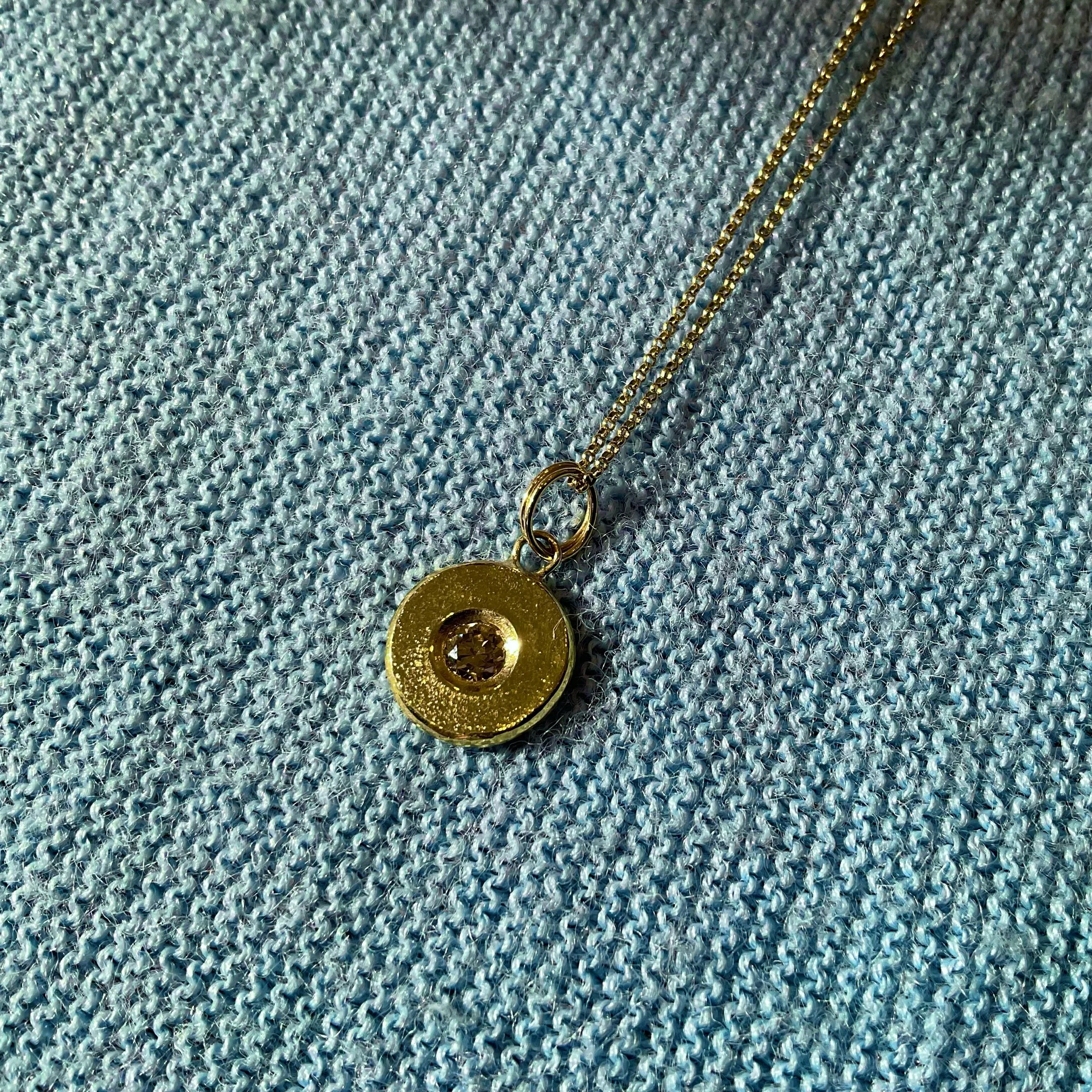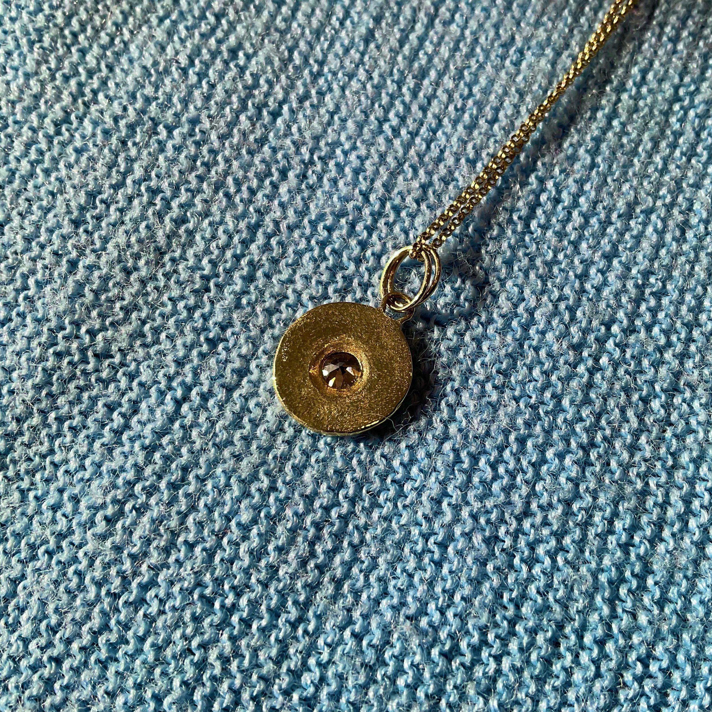 This pendant features a lovely antique diamond in a textured gold setting that is able to be worn on both sides. Details below.