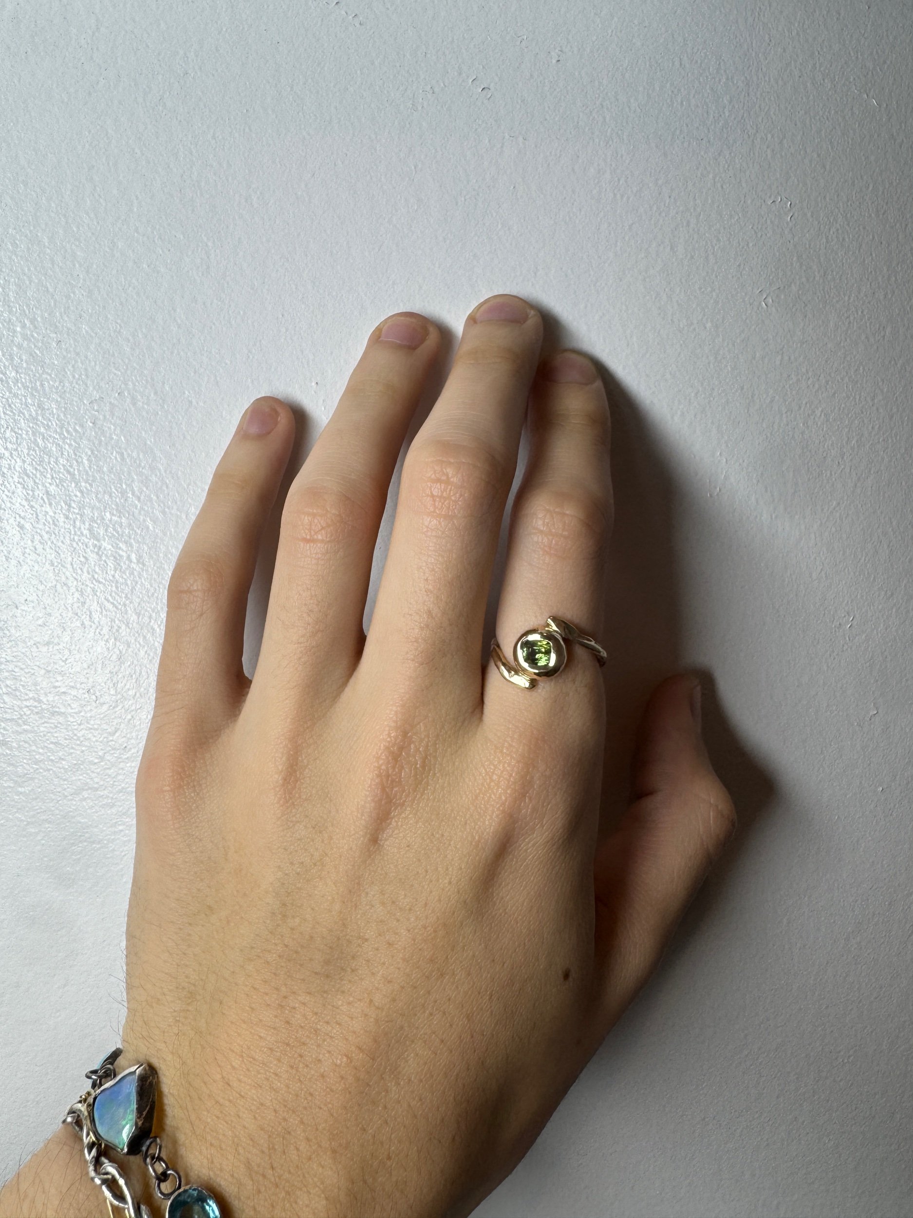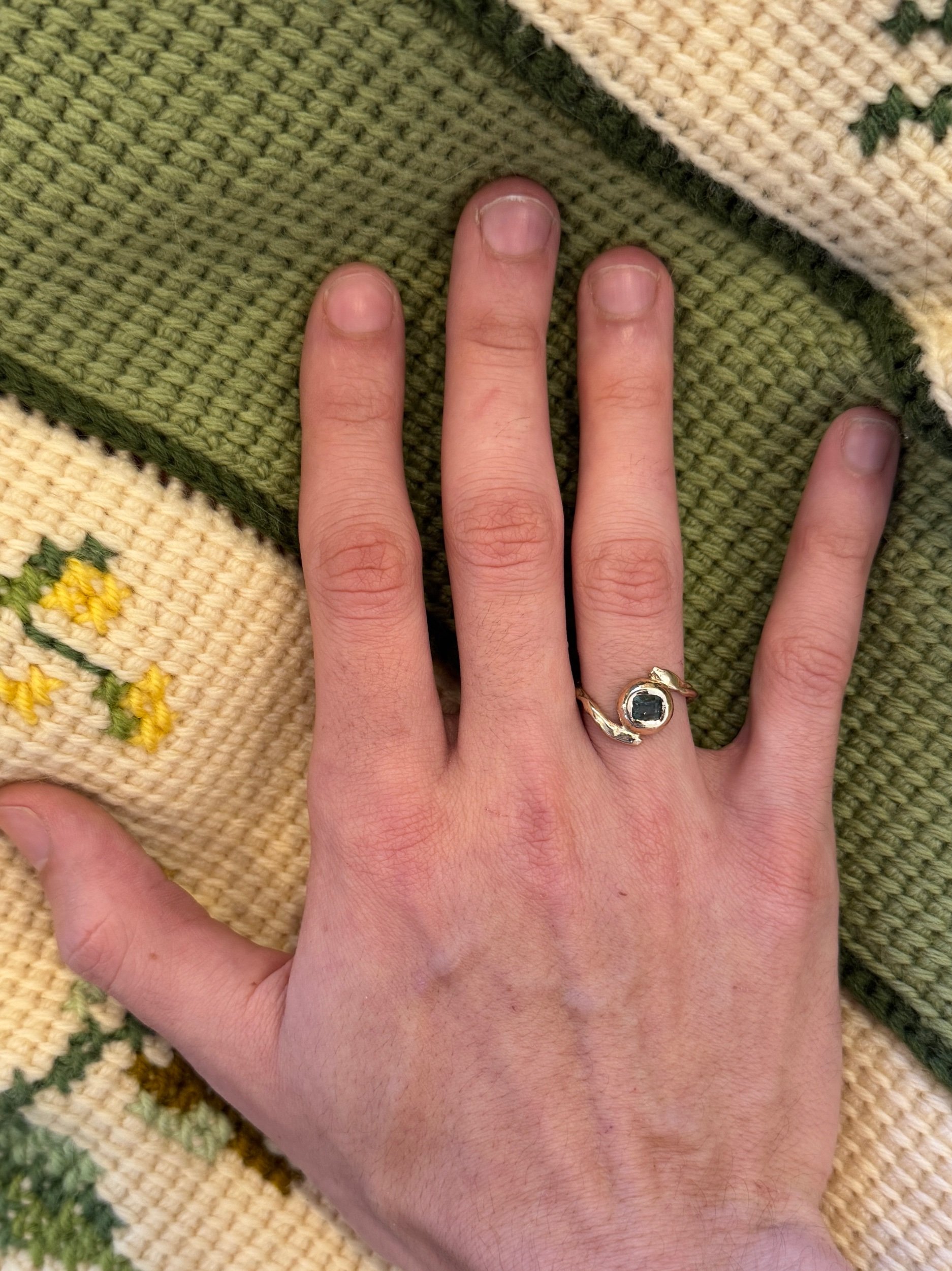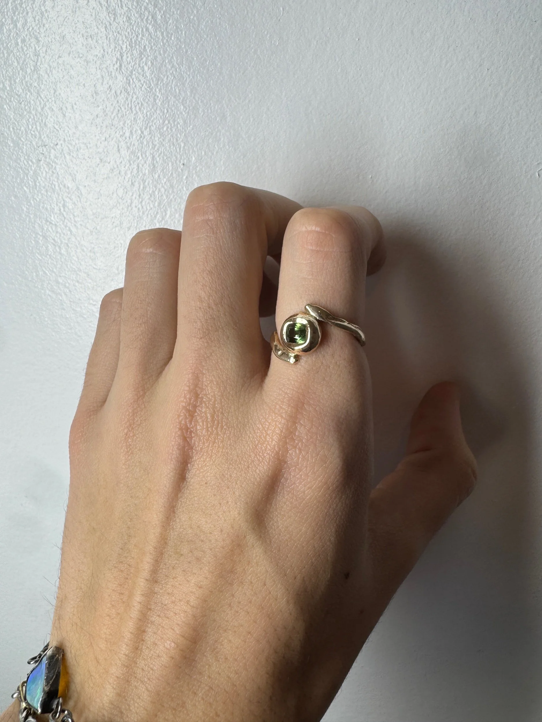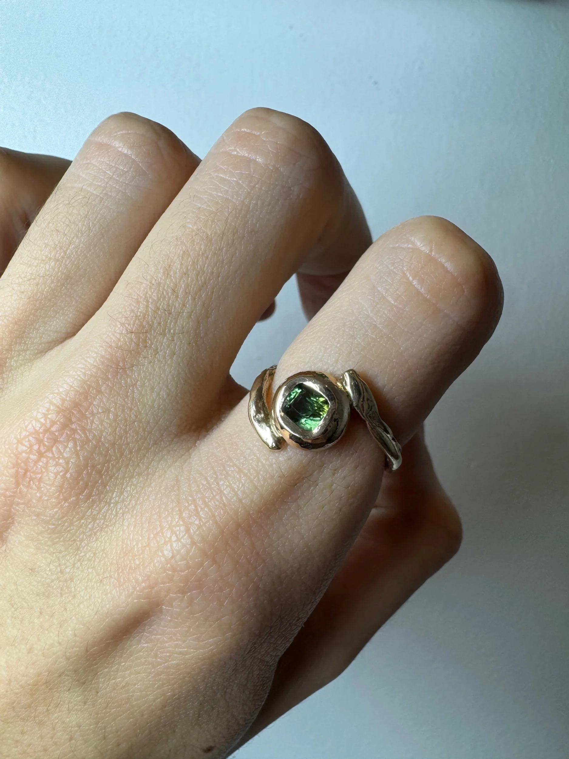 The Terra Ring features a Green Sapphire wrapped in an organic and textural setting. Details below.